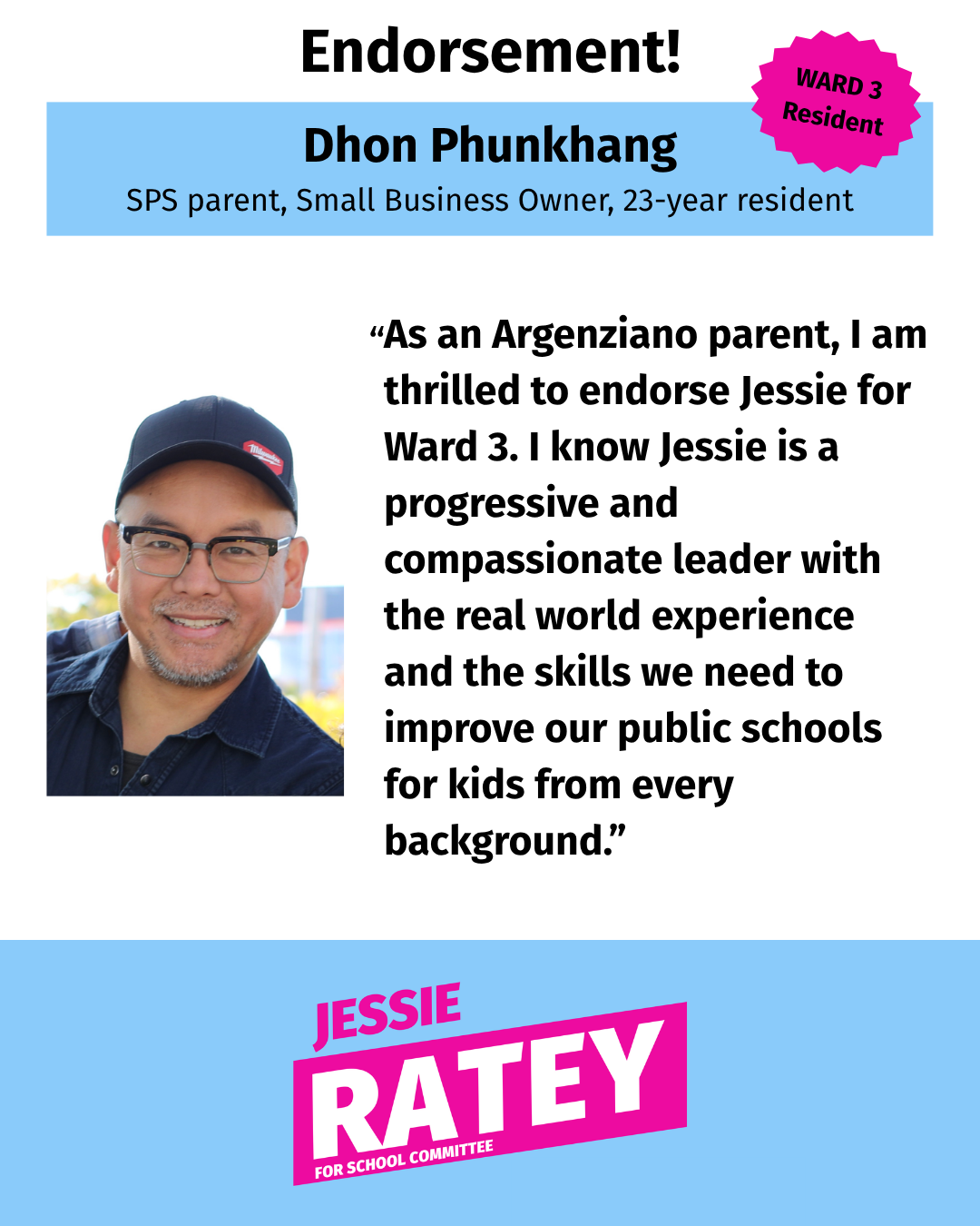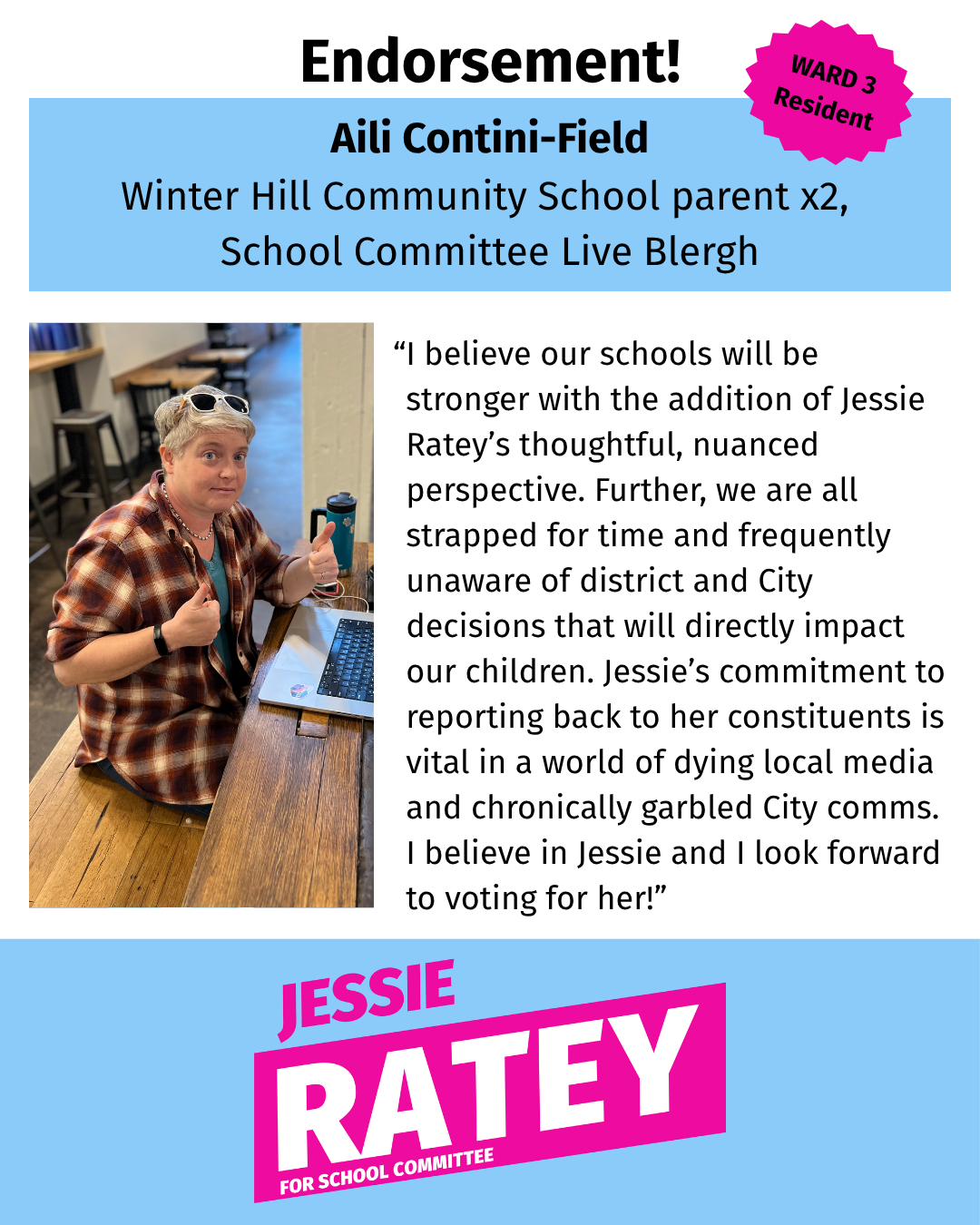 “I'm urging everyone in Ward 3 to vote Jessie Ratey for School Committee.”